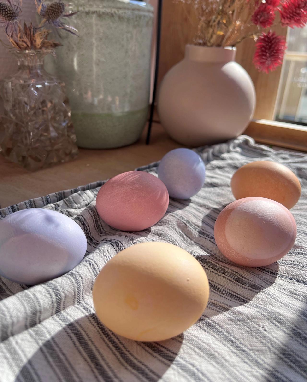Selve farveintensiteten på de færdige æg afhænger både af, hvilke typer frugt og grønt man vælger, men også hvor længe æggene får lov at ligge i farvelagen. I vores udgave har vi brugt rødkål, rødbede og gule løgskaller, men det kan naturligvis varieres, lige som man har lyst.