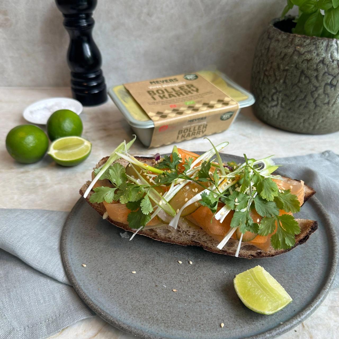 Meyers boller i karry varmes efter anvisningen. Et passende stykke friskbagt baguette flækkes delvist og smøres med chutney f.eks. æble. Fyldes med boller i karry, frisk snittede kål, strimler af gulerod og syltede drueagurk. Toppes med koriander, forårsløg og sesam.