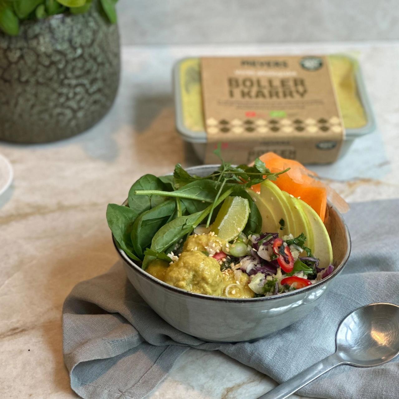 Meyers boller i karry varmes efter anvisningen. Anrettes i en skål på kogte quinoa. Toppes efter behag, eller hvad køleskabet har at byde på, af diverse sylt og grønt. F.eks. kimchi, babyspinat, strimler af gulerod og frisk æble. Drysses med friske koriander, forårsløg og chili.