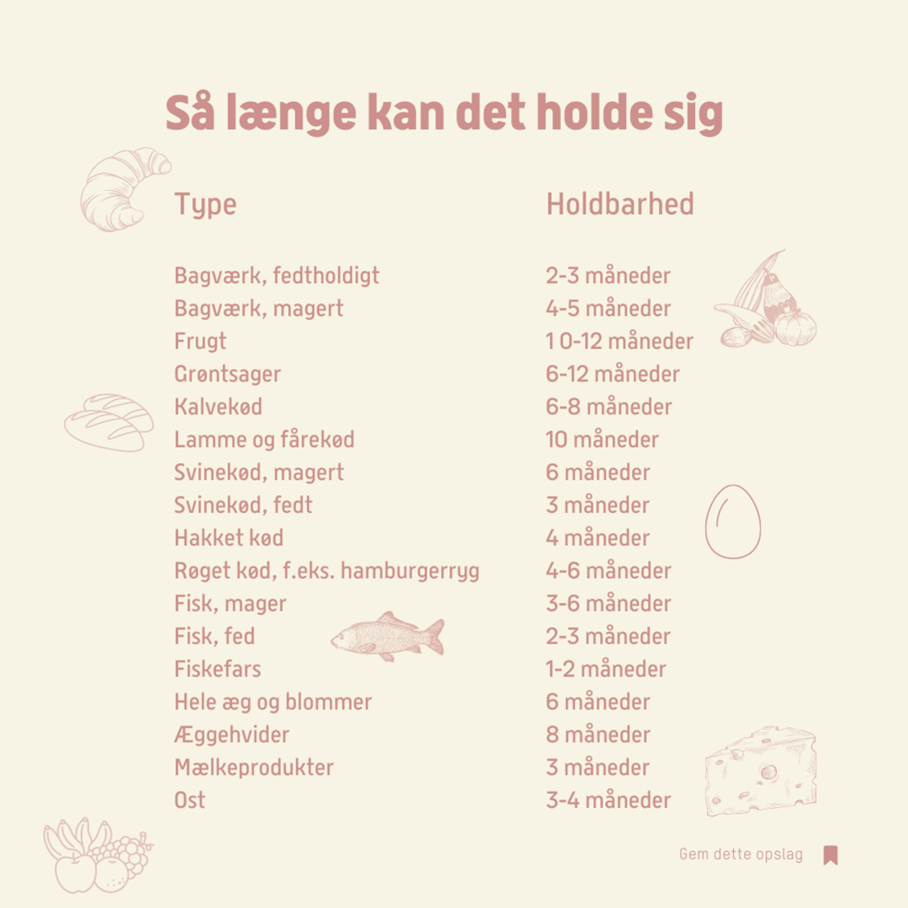 Brug den rigtige emballage, når du fryser madvarer. Fryseemballage skal være tæt for vanddampe og aromastoffer og skal kunne slutte tæt om produkterne. Sørg altid for omhyggelig mærkning af indhold og dato. Mange fødevarer kan opbevares 8-12 måneder i fryseren. Fede fødevarer, som f.eks. flæsk, sild, laks, hakket kød og fars, kan holde sig ca. 3 måneder, fordi fedt er udsat for harskning under frysning. Færdiglavede retter og bagværk kan holde sig ca. 3 måneder.