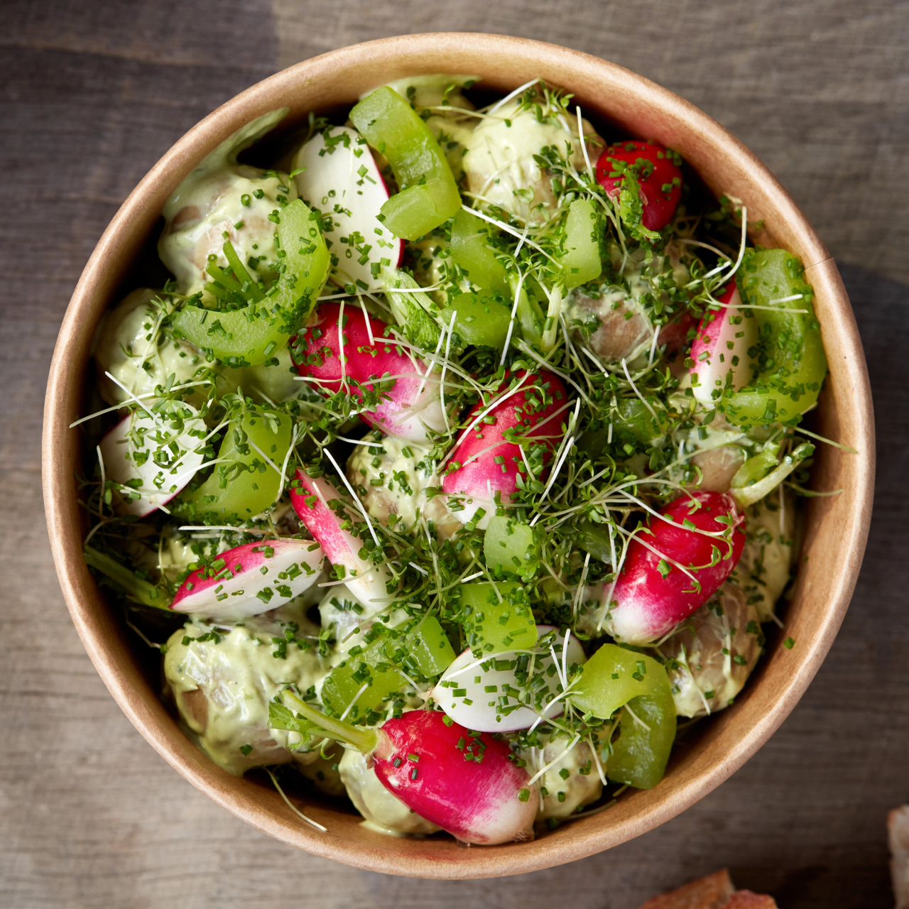 I denne opskrift skal du bruge: 1 kg nye kartofler Havsalt og friskkværnet peber 15 g smør 40 g friskost ½ bundt løvstikke
