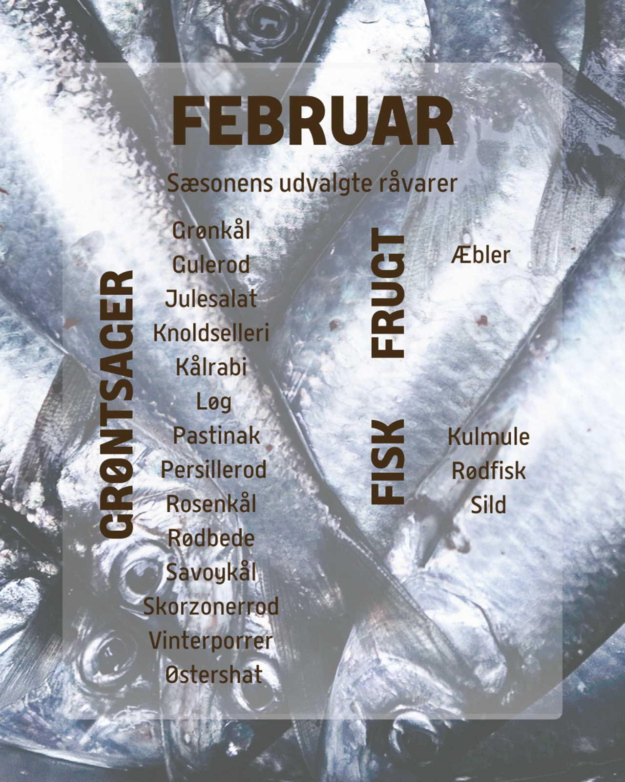 Kål og rodfrugter fylder meget i råvarebilledet med alt fra grønkål, løg, rødbeder, pastinak, kålrabi og meget mere, men i februar er det også i sæson både at spise østers, stenbider- og torskerogn. Du kan se vores overblik over råvarerne nedenfor: