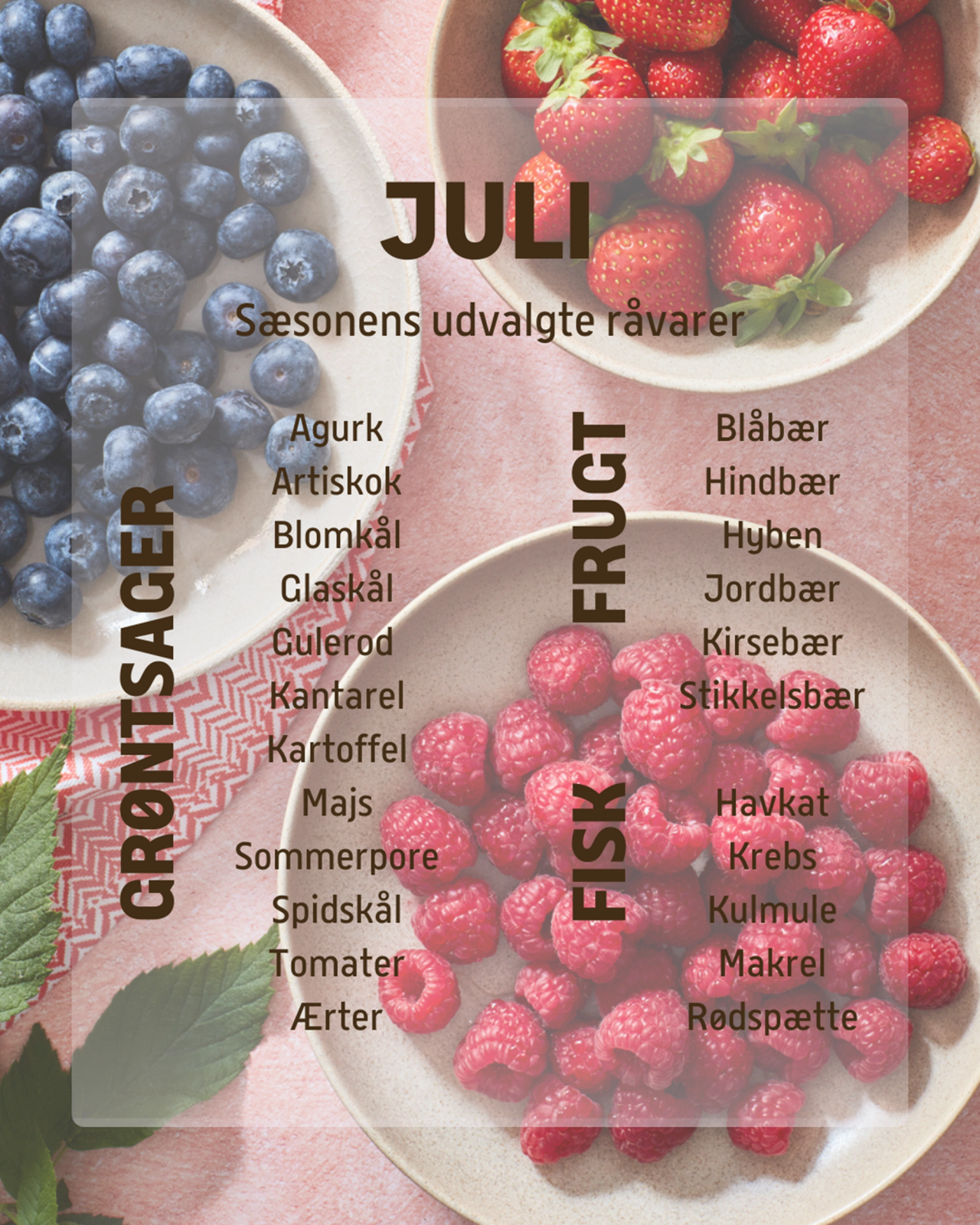 Der sker en masse vidunderlige ting i naturen når kalenderen rammer juli måned, hvor det danske landskab er fuld af liv, nye sommergrøntsager og solskin. Du kan se vores overblik over råvarerne i sæson nedenfor.