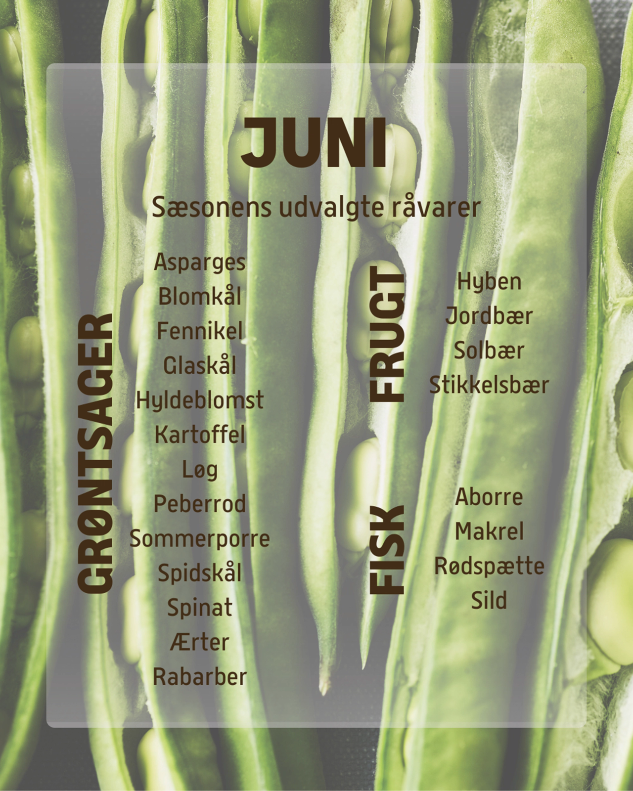 Der sker en masse vidunderlige ting i naturen, når kalenderen rammer juni måned, hvor det danske landskab er fuld af liv, nye sommergrøntsager og solskin. Du kan se vores overblik over råvarerne i sæson nedenfor: