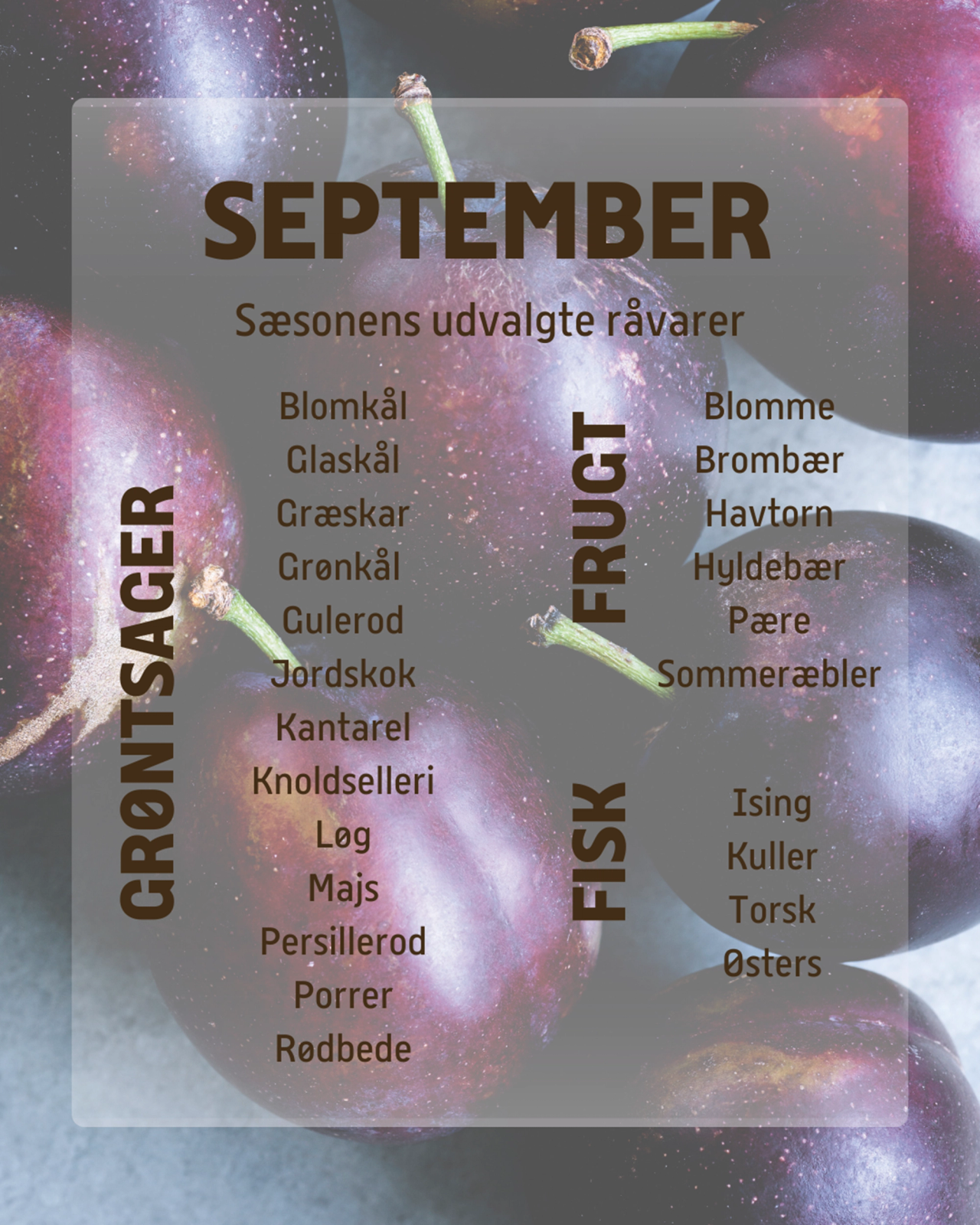 Vi har lige vinket farvel til årets sidste sommermåned, og kan nu byde velkommen til den første efterårsmåned - september. Om ganske kort tid vil vi kunne se den danske natur reagere på ændringen i årstiden og sæsonen. Det smukke skift kan tydeligt ses, når træernes blade skifter farve fra grøn til hele efterårspaletten, og pryder landskabet med ikoniske gule, røde og brunlige nuancer. September er samtidig en interessant måned råvaremæssigt, da høsten for alvor bliver skubbet i gang, mens skoven bugner af brombær, blommer, hyldebær og en masse andre syltefrugter. Du kan se vores overblik over råvarerne i sæson nedenfor: